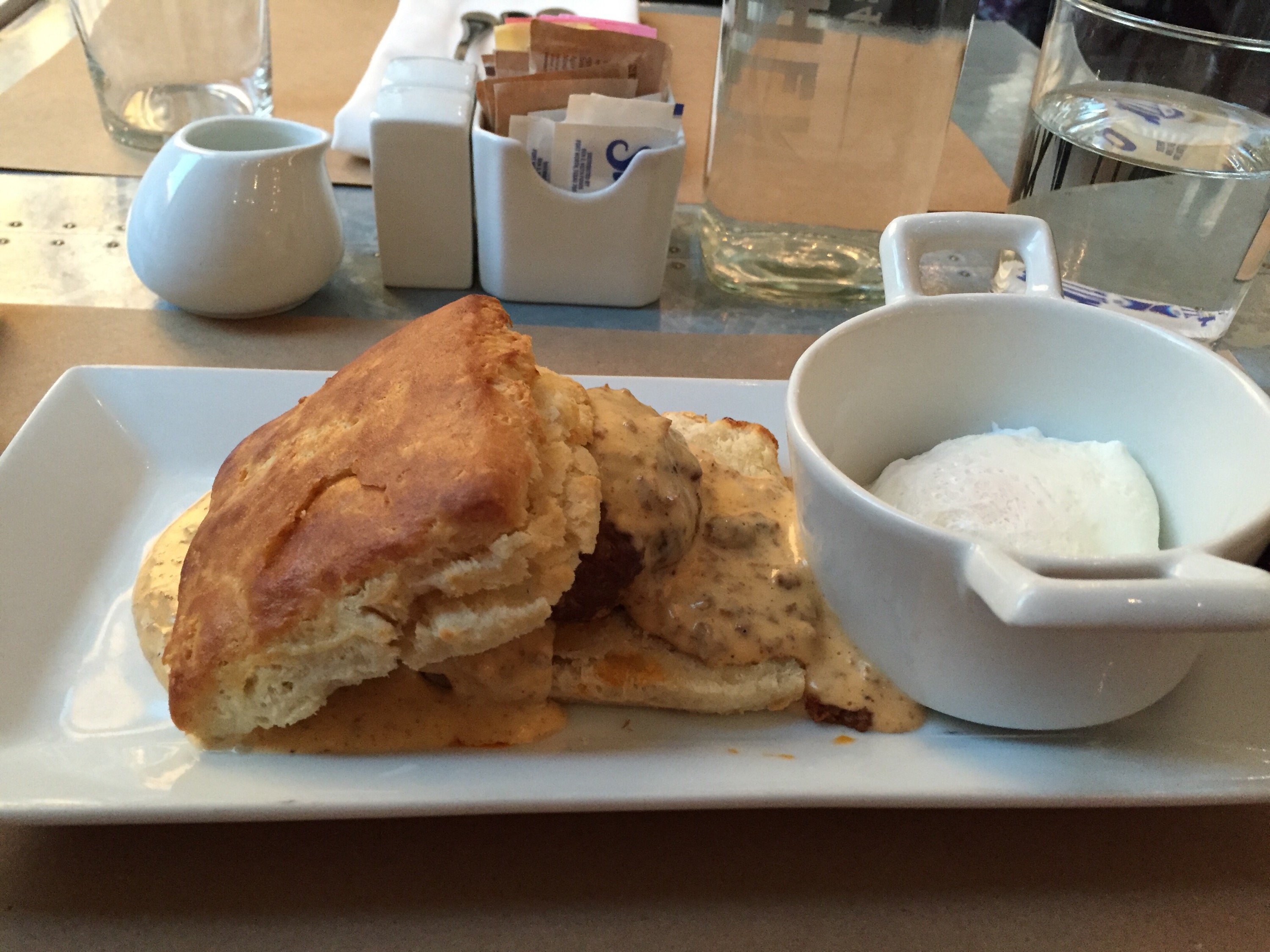 That, dear friends, is a scratch biscuit with chorizo gravy and a poached egg. I’m a happy camper!